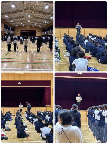 さて、1年生の集会では、体育館に入った段階で背筋が伸びるような雰囲気が感じられました。というのも、生徒たちが一言も言葉を発せずに整列着席していたからでした。学年主任の山口先生から名札の忘れ物の確認などが行われた後、集会が始まりました。