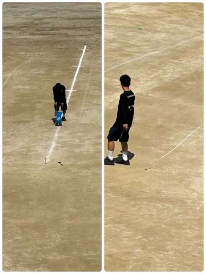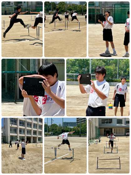 学習者用端末を交代で活用し、走り終えた生徒は映像でフィードバックしていました。