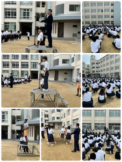 本日は雨の予報でしたが、気持ちよく晴れたおかげで運動場で全校集会を行うことができました。