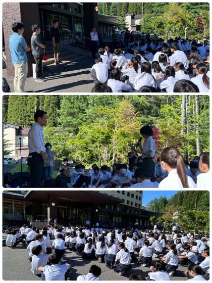 退館式の様子です。 学年全体の写真撮影も行い、お土産購入の牧歌の里に向かっています。