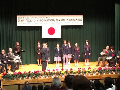舞台での表彰式のあと、西淀川区長賞に輝いた1年1組の中筋由姫さんが作品を朗読しました。