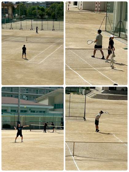 女子テニス部が試合形式練習を行っている際、ソフトボール部顧問の西川先生がアドバイスらしき動作を行っていました。