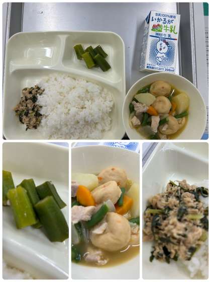 ご飯、鶏肉と一口がんもの煮もの、オクラ梅風味、ツナッ葉いため
