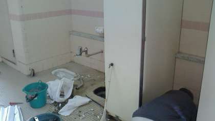 上の写真はトイレブースが並んだ状態です。真ん中の写真は、2つのブースを1つのブースにするために仕切りや扉を取り外したところです。下の写真は和式から洋式に変更するブースでの作業場面です。