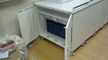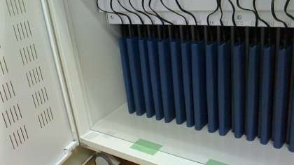 保管庫に立てて置いておきます。下の写真では青色のケースにタブレット型端末が入っており20台が並んだ状態です。黒い線は充電用のコードです。