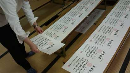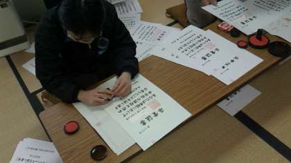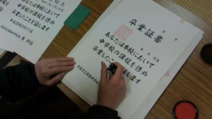 捺印後は朱肉が乾くまで、テーブルに並べて置いてます。ところ狭しと卒業証書の並んだ様は壮観です。