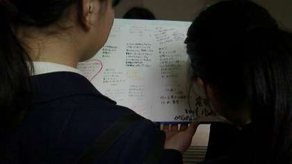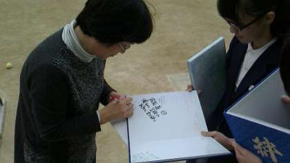 グランドで先生方にアルバムに記帳していただいている生徒を見かけました。