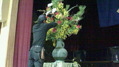 舞台を飾る盛り花も、生花店により豪華に生けていただきました。