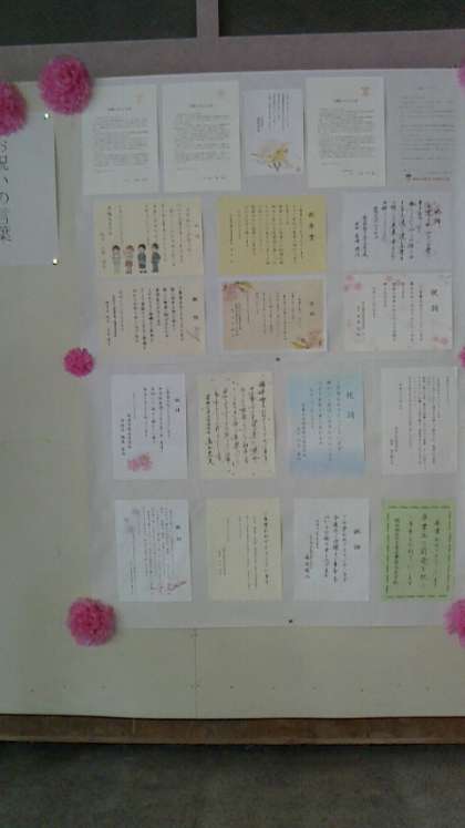 保護者の方も早朝から駆け付けた下さいました。体育館入口ではいろいろな飾りつけがしてありました。祝電・祝辞が多数掲示され、卒業生を祝う言葉で埋め尽くされていました。