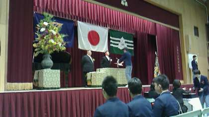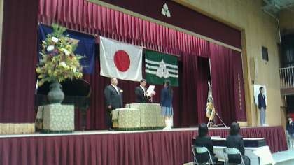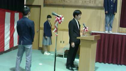 「卒業証書授与」では、卒業生は壇上の脇にあがり、担任の先生に名前を呼ばれ「はい」と返事をして、舞台中央へ進みます。校長先生に正対し丁寧にお辞儀をし、卒業証書を手渡しでいただき、脇に証書を挟み、お礼のお辞儀をします。どの生徒も大きな声で返事をし、深々としたお辞儀で好感が持てました。壇から階段を下りて、先生に証書ファイルに入れていただきました。