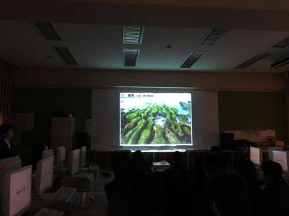 パソコン教室の後ろに貼られた巨大な土木作業用シートに、プロジェクターで投影される写真やインターネット上の動画を見ながら、地層の形成に川が関わっていることを学びました。