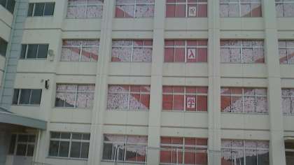 1号館のグランド側に1階〜4階を利用して、生徒達手作りの「満開の桜」があります。手作りの「満開の桜」には、祝入学 とあります。