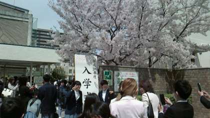 正門での「入学式立て看板」前は、人気スポットです。順番待ちの列が続いていました。