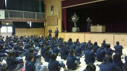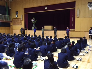 真ん中と下の写真は2年生の学年集会の写真です。学年主任の武林先生からは、2年生としての心構えと生徒指導のお話しがありました。田中先生からは教科についてのお話がありました。先生方のお話に、生徒達は静かに集中して聞いていました。