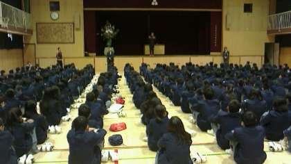 3年生は放送による始業式の開始時点から体育館に入っていました。上の写真は始業式で担任紹介された時の写真です。引き続き体育館にて3年の学年集会を行いました。