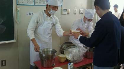 3年生の教室での配膳の様子です。係の生徒から「中華煮」を並んで受け取っていました。