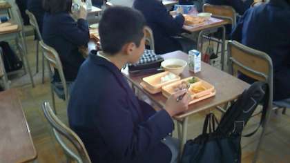 3年生の学年は1年生のときから、授業中のときと同じく自分の机を前にむけたままの食事です。給食にも学年ごとの特色があります。