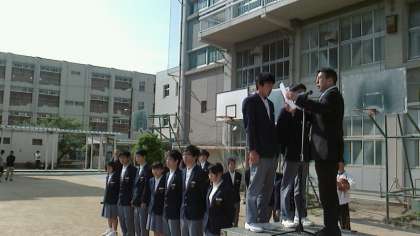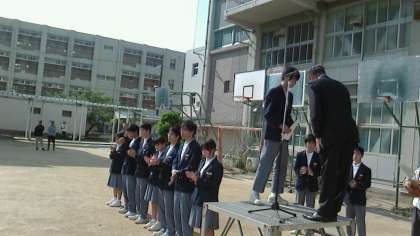 4月25日(月)は早朝より、快晴で心地よい気温となり全校集会には絶好の季節となりました。