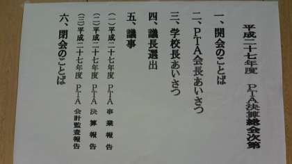 小川PTA副会長の司会で開始しました。規約により竹本PTA会長の議長で定足数確認後、議事が進められました。「平成27年度PTA事業報告」と「平成27年度PTA会計決算報告」が承認されました。