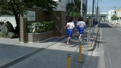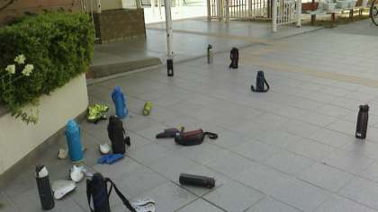 あまりの暑さに熱中症の心配すらしています。「水分を十分取るように」と校内放送もありました。通用門前に水筒が林立していました。学校の周りを部活動で走っている生徒たちが、走り終えてのどを潤していました。