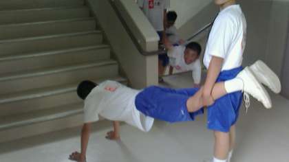 グランドでの活動はできず、廊下で基礎練習を繰り返している部活動もありました。野球部では手押し車で、廊下や階段のぼりでパワーアップのトレーニングに汗を流していました。