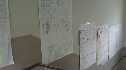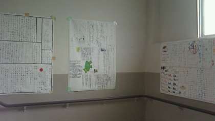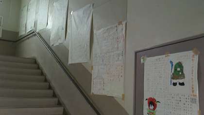 取組・学習の成果を模造紙に書いて、1号館の階段や踊り場にたくさん掲示されています。教室へ向かう生徒の目に触れる場所で、生徒達がいろんな知識を吸収していました。