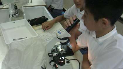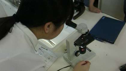 顕微鏡は新しいタイプで、光源にLEDを使った新しいものでした。生徒は顕微鏡の扱い方をタブレットで確認しながら、画像調整し観察していました。