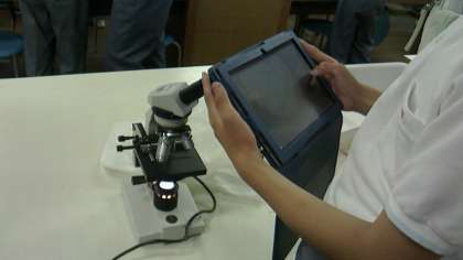 顕微鏡で見た細胞の画像は、タブレット端末で画像として残すことができます。