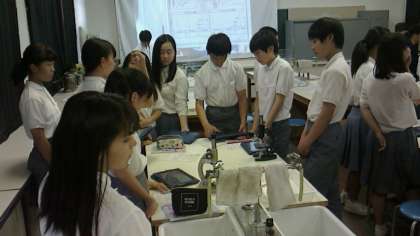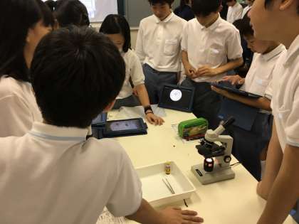 各班でどの画像を提示するか検討しています。写真では画像を確認し、どの画像がよりよく細胞の様子を映し出しているか相談している場面です。タブレットを中心にした輪ができていました。