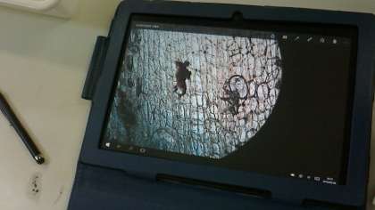 2番目の写真が、タブレット端末で撮影された画像です。3番目の写真は、教師のパソコンに送られてきた画像を、スクリーンに映し出した画像です。デジタルの画像ですので元の画像と写しだされた画像と、そん色なく見ることができています。