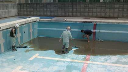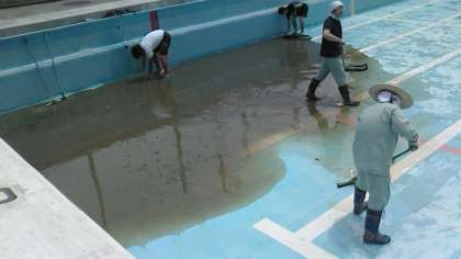 6月1日(水)の午前中に体育科の先生方と管理作業員さんに、プール清掃をしていただきました。