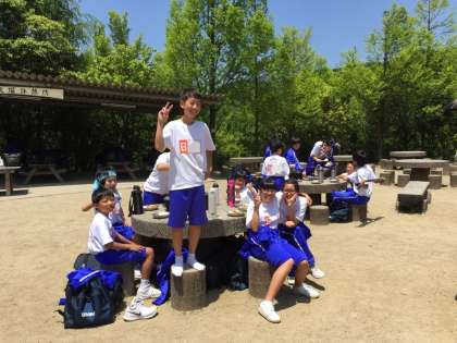 昼食場所は、屋根のある場所だけでなく、日なたで食事をするグループもありました。