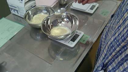 最初に電子ばかりで、パン粉と牛乳を計量します。班員が手分けしてそれぞれが計量しています。