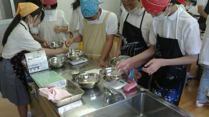 先生の説明の後、エプロン・三角マスクをつけて、手洗いをして調理実習開始となりました。