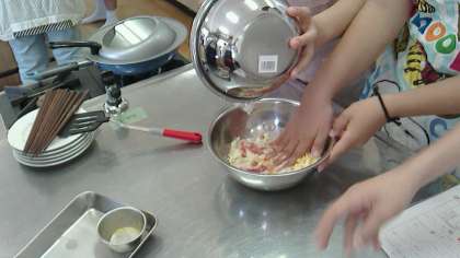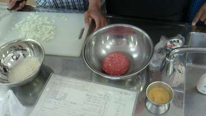 みじん切りした玉ねぎとパン粉・卵・コショウを入れてしっかり混ぜています。