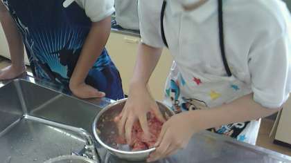 合びき肉をボールに入れて粘りが出るまで手でこねました。
