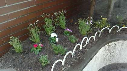 植付はプランターだけでなく、正門南側の花壇にも植えていただきました。