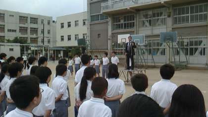 6月20日(月)は、前夜の雨でグランド状態を心配しましたが、雨が降ることもなく無事グランドで全校集会を行うことができました。