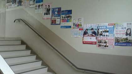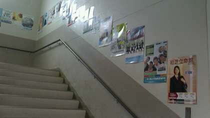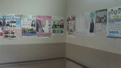 1号館の階段の壁面に、高等学校のポスターがたくさん掲載されています。