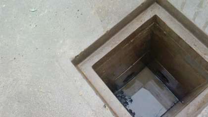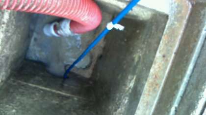 上の写真では、高圧ホース先端部から後ろ向きに水が飛び出しており、赤茶色の手袋のところで確認できます。手作業では取れなかった固まった土が解けて流れだし通管ができました。マンホールの中はきれいになっています。