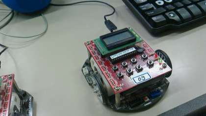 各自自律型ロボット(モーターによる動く車)を1台を、パソコンとUSBケーブルでつないで、パソコンからの指示通りに動かすという授業でした。自律型ロボットはマザーボードとモーターと乾電池からできています。