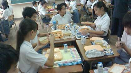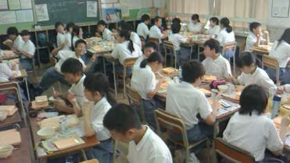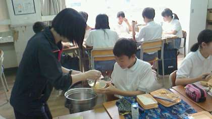 先生から味噌汁のおかわりをいただいての給食でした。班員との会話も弾み和やかな給食風景でした。