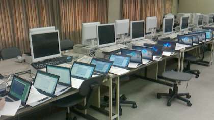 パソコン教室の教習用テーブルに授業用パソコンをずらりと並べて、1台ごとに設定作業が行われています。気の遠くなるような地道な作業です。
