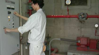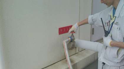 検査では1号館屋上にて、消防ポンプを実際に動かしての圧力試験がなされました。5号館からは相当離れていますが、ホースの先につけられた試験装置からは力強く噴射が出ていました。