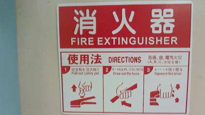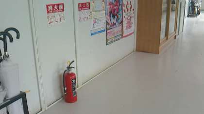 火災発生時の一番身近な消火装置としては、消火器かと思います。今回検査で数えてみますと、60数本の消火器が廊下等を中心に配置されていました。