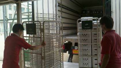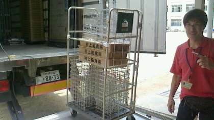 台車に載せてスロープを下り、廊下をとおりトラックまでやってきました。給食の食器かご・牛乳缶をのせた台車が、リフトでトラックの荷台に載せ並べられました。