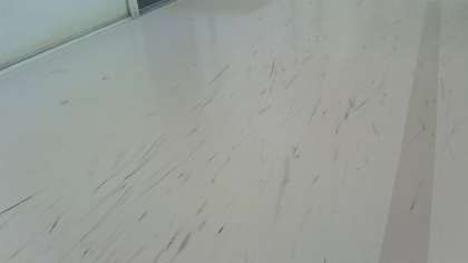 2.剥離剤(ワックスを取り除く洗剤)を床にまき、ポリシャーで隅から隅までごしごしこすってワックスを浮かします。