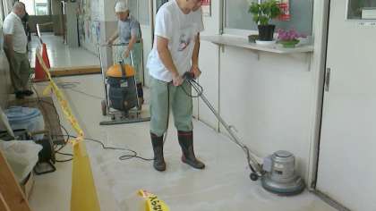管理作業員さんに職員室前の廊下のワックスがけをしていただきました。
