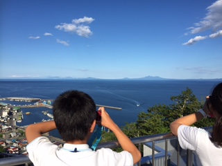 羅臼の国後島が一望出来る展望台に来ました。前方は海と国後島、後方は羅臼岳などの山々という雄大な景色を眺めました。