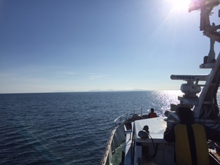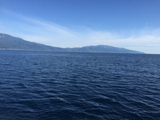 最終日は国後島を船に乗って、見に行きました。羅臼から国後島は20kmほど離れています。10kmほどなら近づくことが出来るそうです。それ以上近づくとロシア船に拿捕されるそうで、まさに国境の上まで近づくことが出来ました。